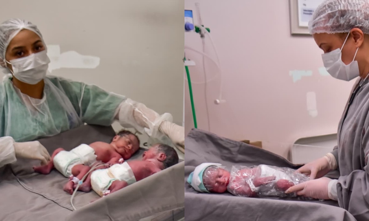 Partos de trigêmeos são eventos raros, refletindo uma porcentagem inferior a 1% do total de nascimentos anuais no Brasil, conforme dados do Ministério da Saúde. A primeira a chegar foi Kiara, às 16h05, com 2,260 kg e 45 centímetros. Logo em seguida, seu irmão Gustavo nasceu às 16h06, pesando 1,960 kg e medindo também 45 centímetros. Por último, Hanna veio ao mundo às 16h08, pesando 1,940 kg e medindo 44 centímetros.
